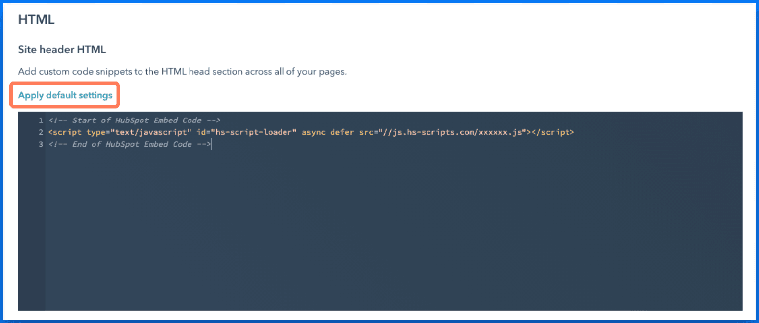 To revert a specific domain's header HTML to the Default settings for all domains instead, click Apply default settings.