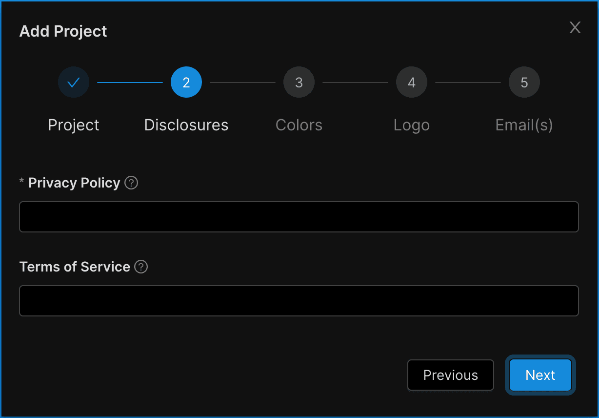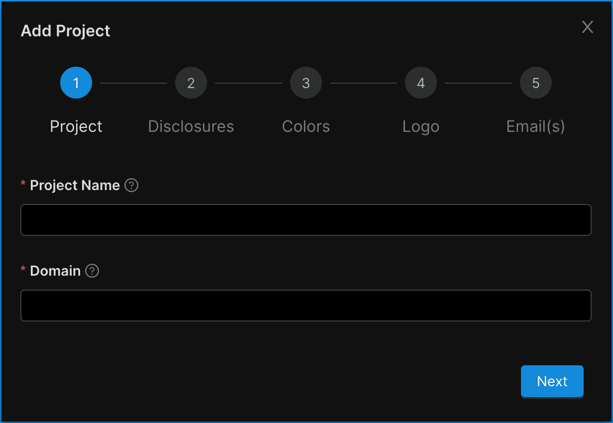 - List the domain with which the Project will be associated. The UI will confirm if you have entered a properly formatted domain. It is not necessary to prepend “http://” or “https://” to your domain.