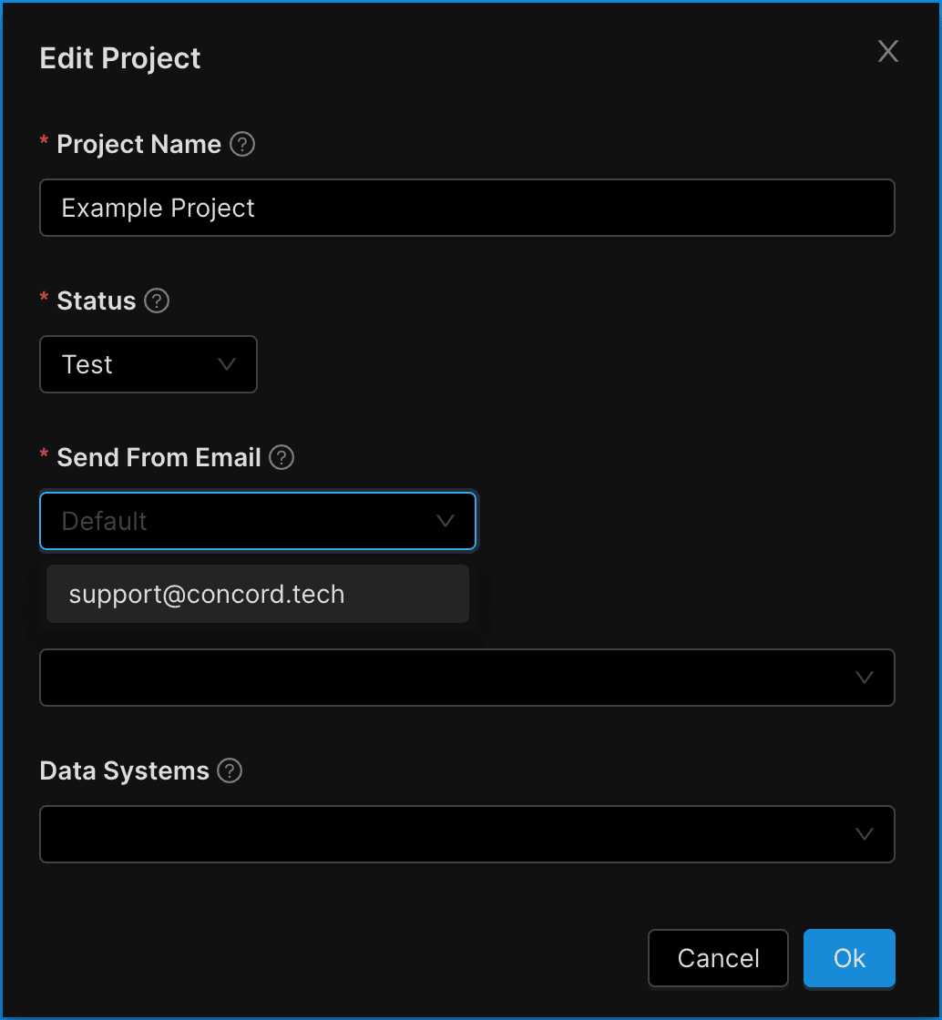 Assigning a Send From Email to your Project allows you to choose what address and sender your customers see when receiving email communications related to their compliance requests for that specific project. The default Send From Email for Projects is support@concord.tech, but can easily be changed by following the steps below.