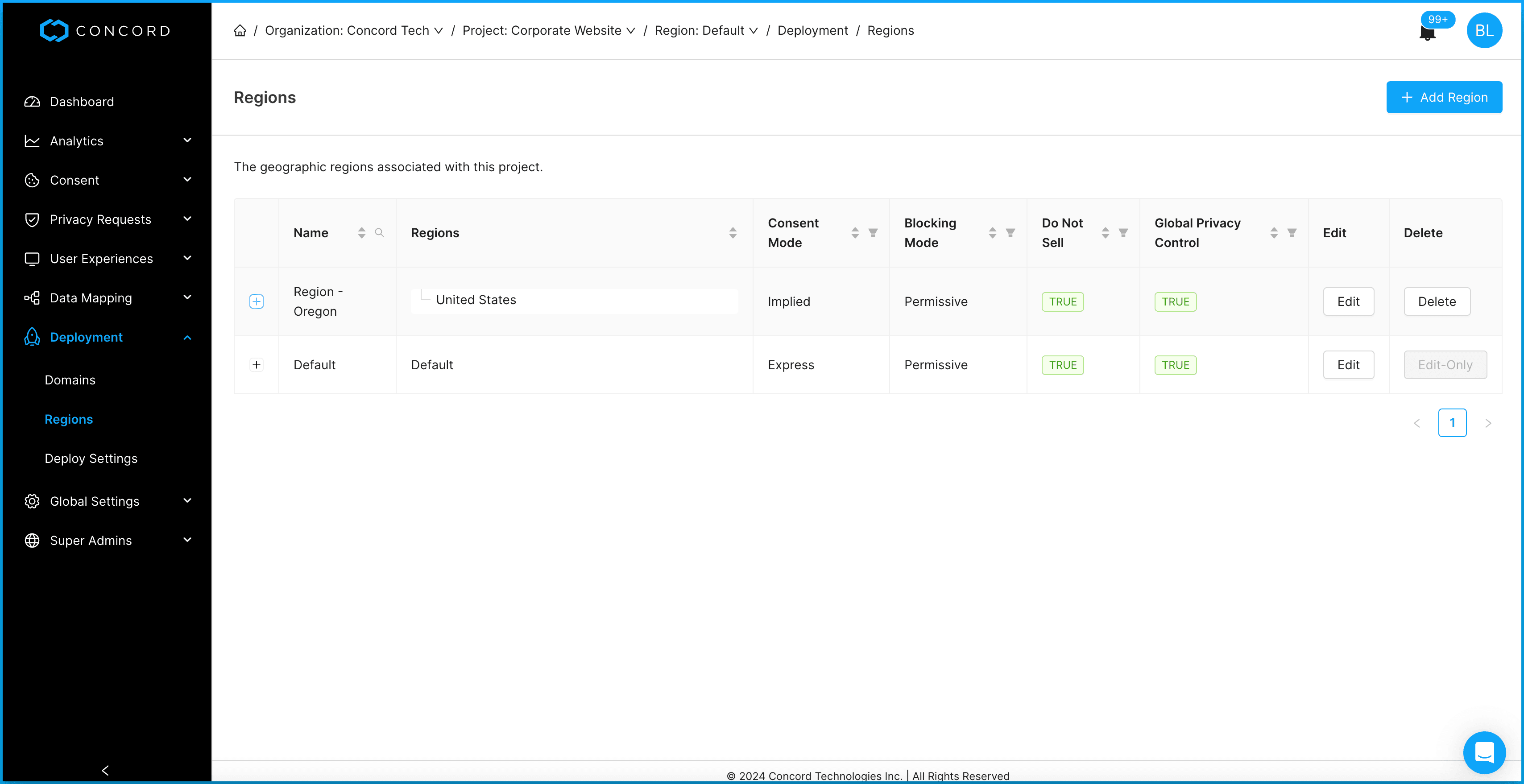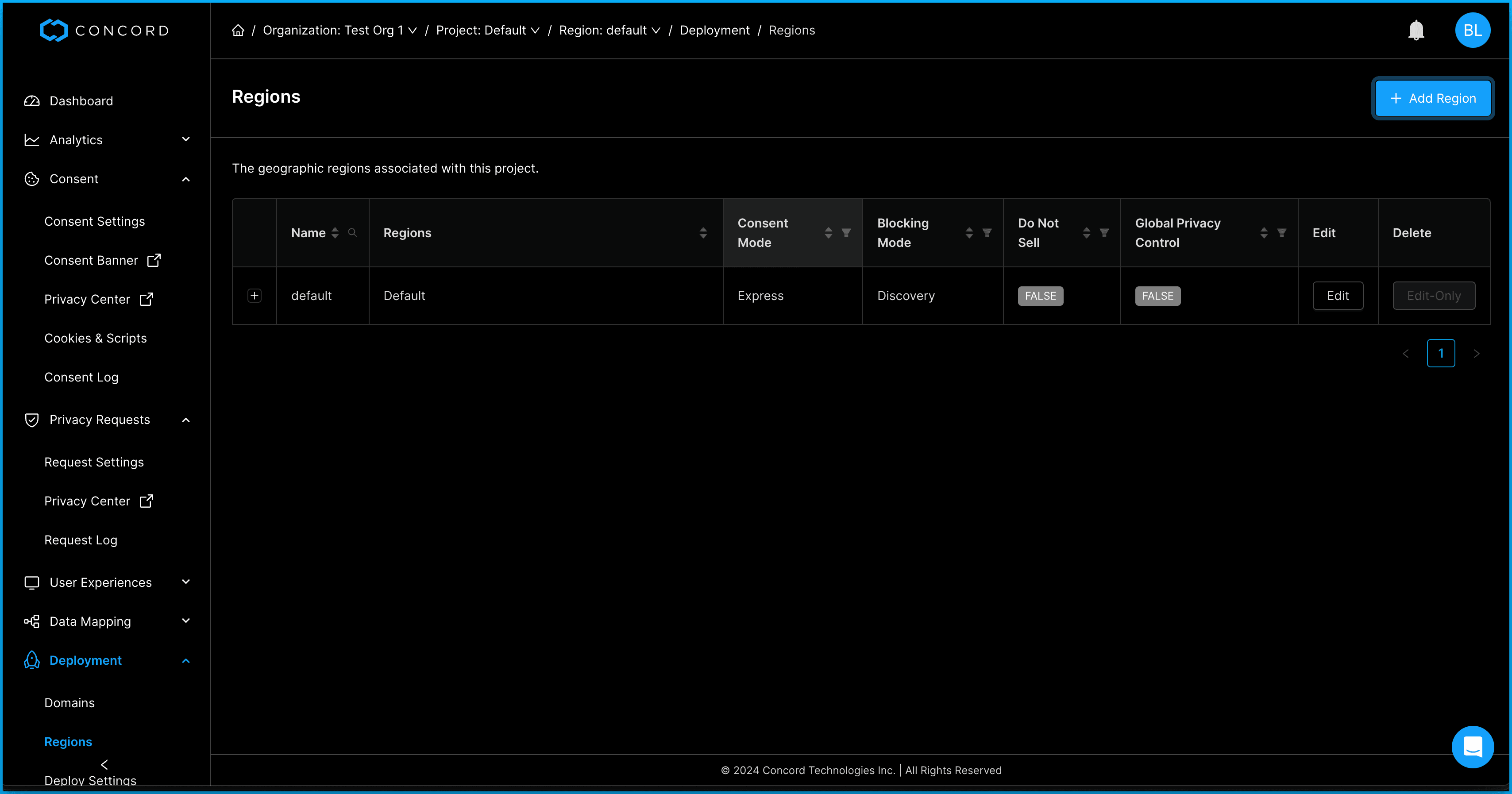 Login to Concord and navigate to Deployment → Regions. The Default region can be configured from this page or through settings on the Consent → Consent Settings → General Settings. Note that the Default region cannot be deleted and that a user will see the Default consent banner if there are no other matching region rules based on the user's location.