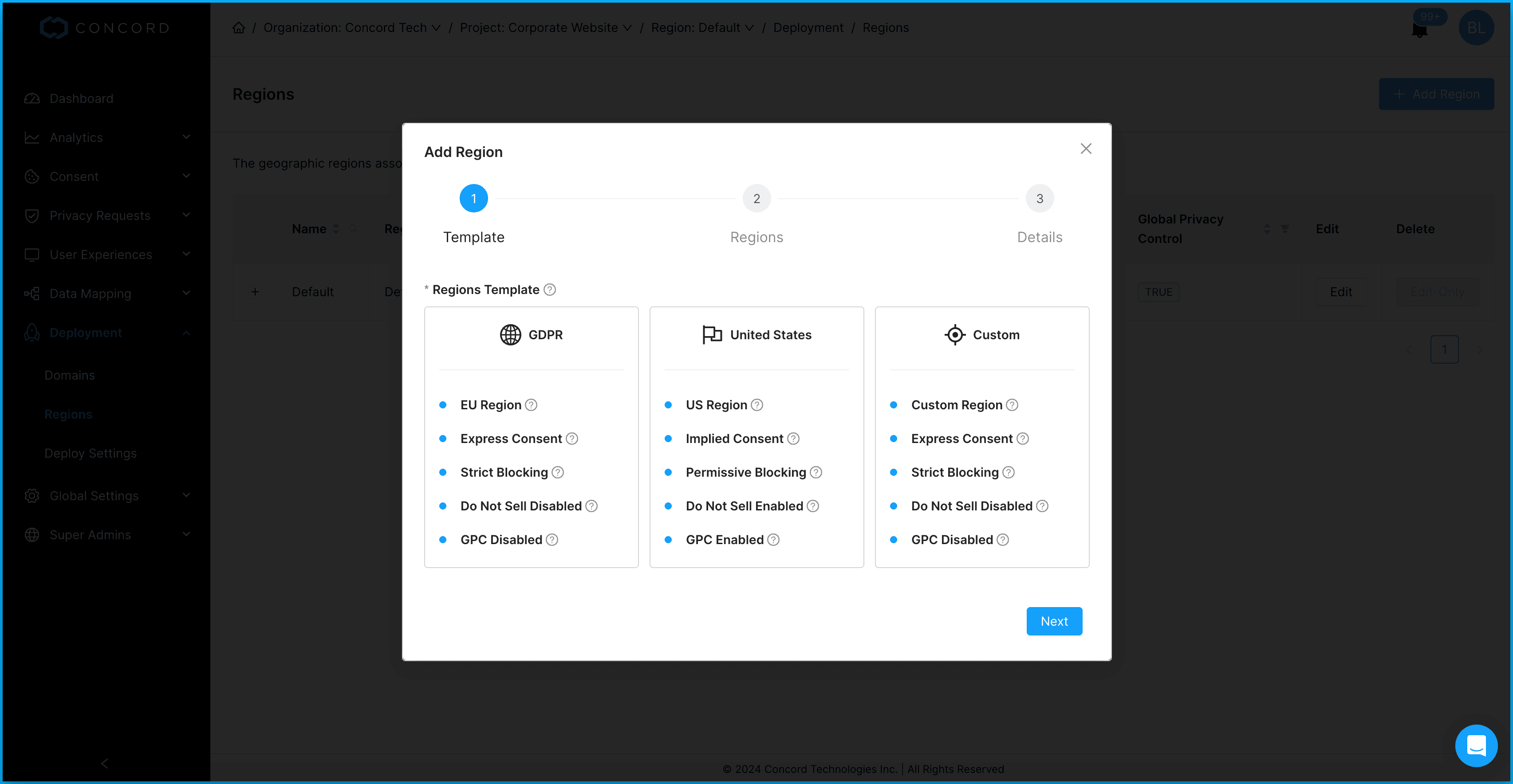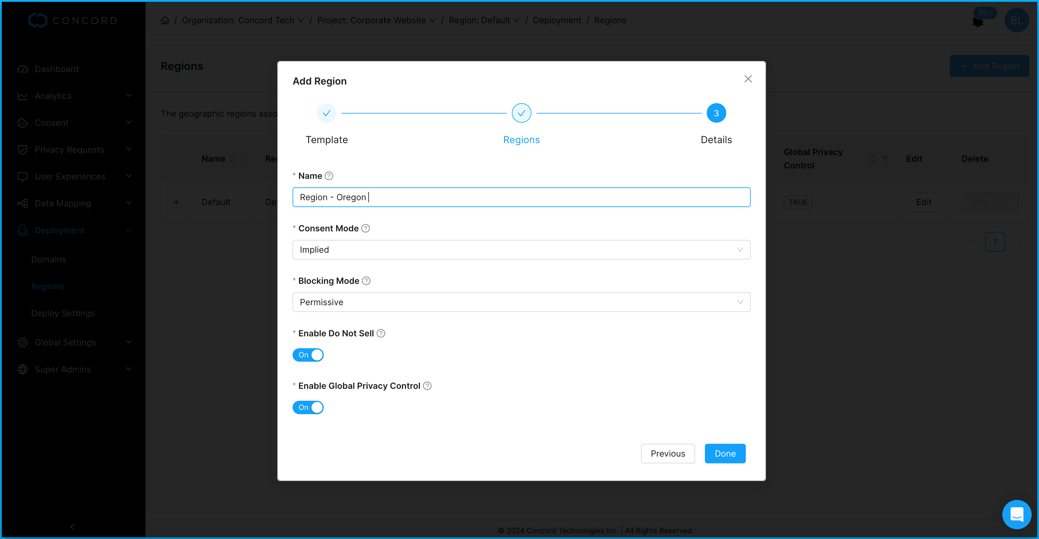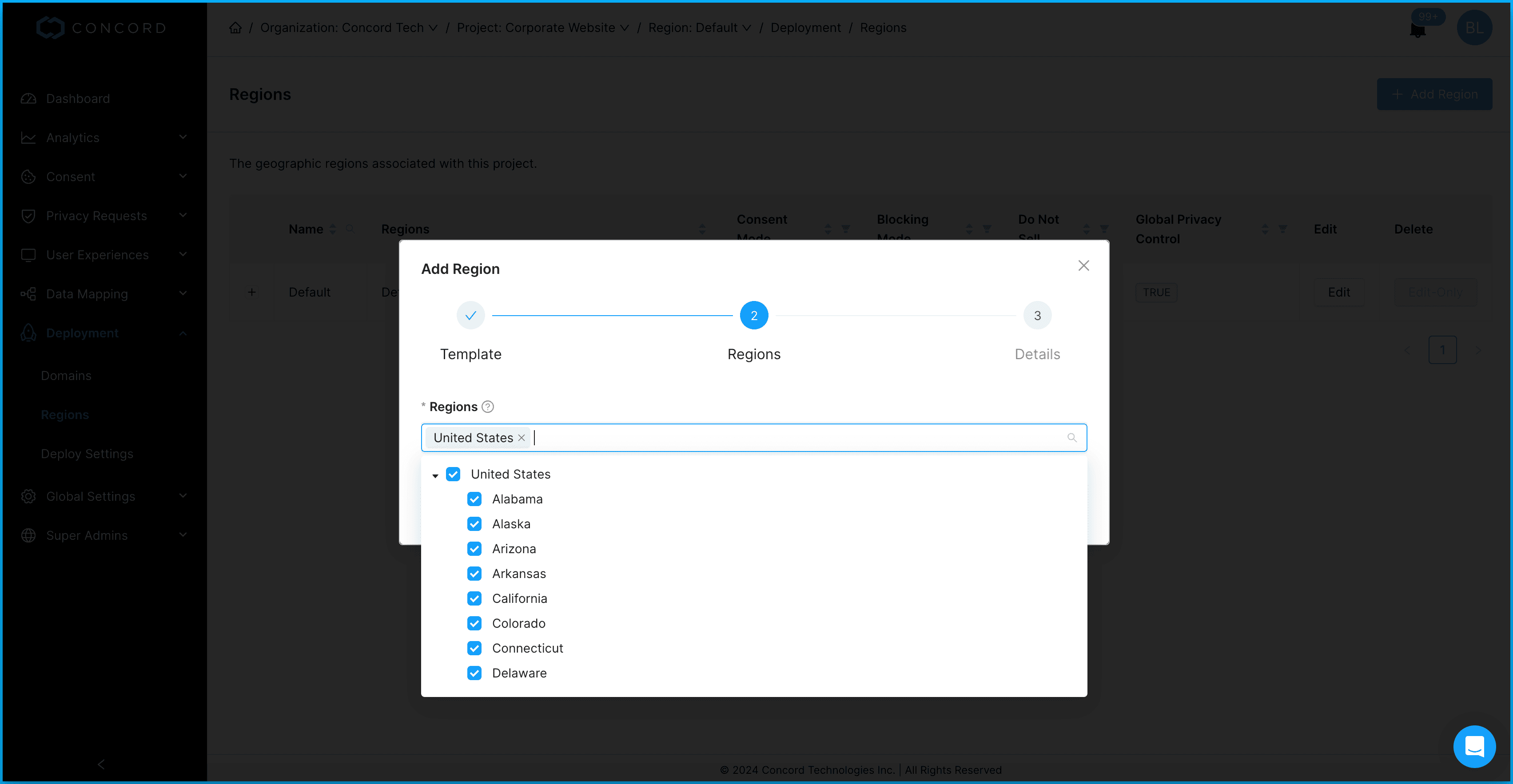 Regions are used to customize the behavior and experience based on an individual user's location. As an example, this allows you to provide different experiences to users based on regional differences (like GDPR in the EU vs. CCPA/CPRA in California). When a user visits your site, we will automatically determine their location and will match them to the most granular region rule that you have setup in Concord. This can go down to the state/province level, which allows for different experiences for different laws (like CCPA/CPRA in California). While you can get as granular as you want, we typically recommend a single global policy that meets the strictest guidelines across regions, or higher splits (like separate GDPR and United States regions). If you have any questions on how and why to configure your regions in certain ways, please reach out to our support team.