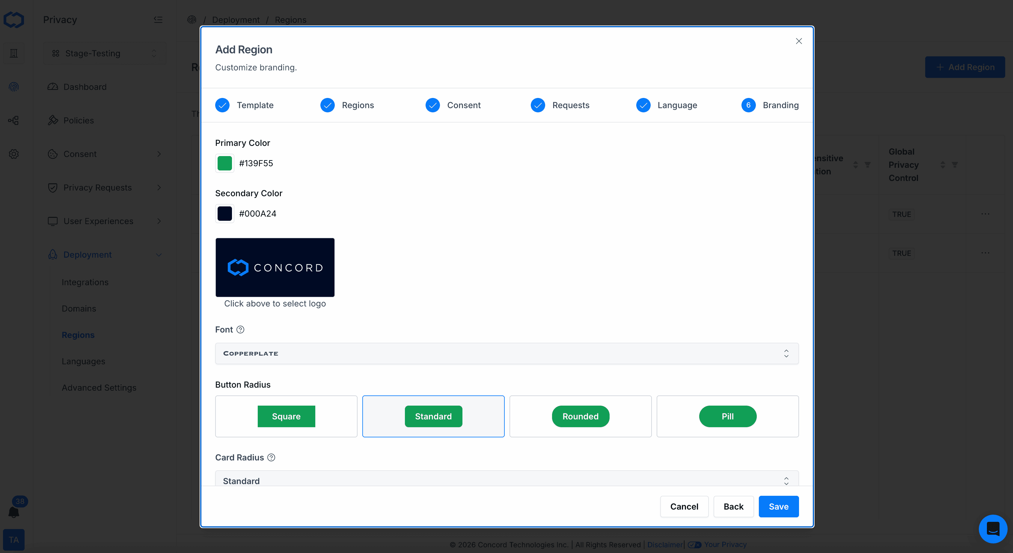 - On the Branding tab, you can customize the look and feel of the consent banner by region including: