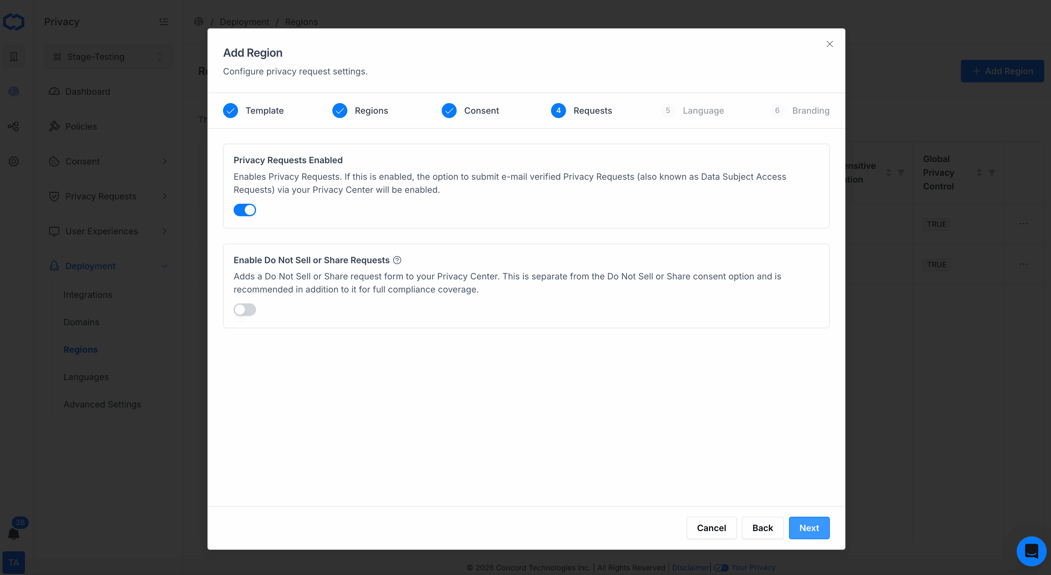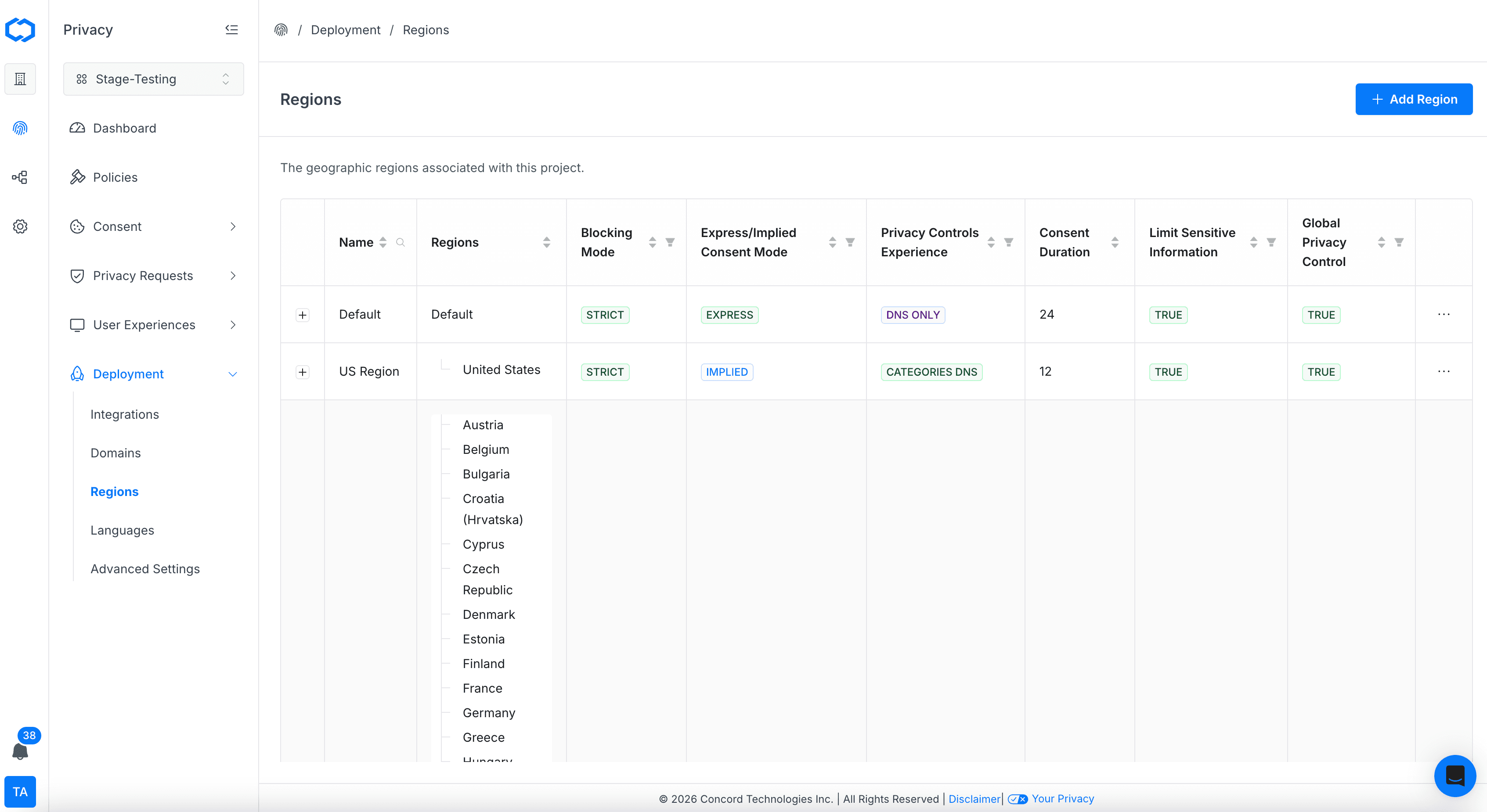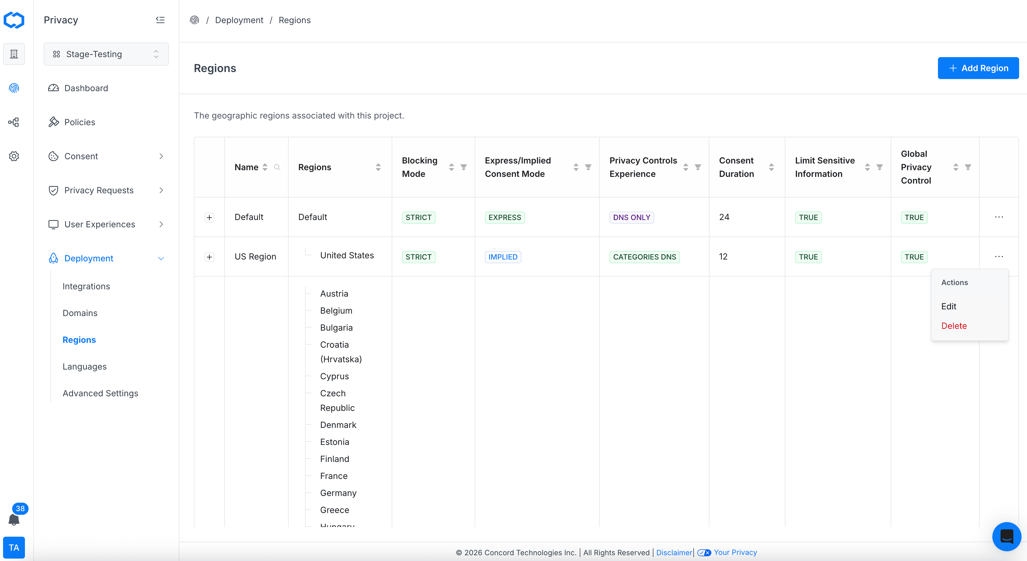 - Login to Concord and navigate to Privacy → Deployment → Regions. Note that the Default region cannot be deleted and that a user will see the Default consent banner if there are no other matching region rules based on the user’s location.