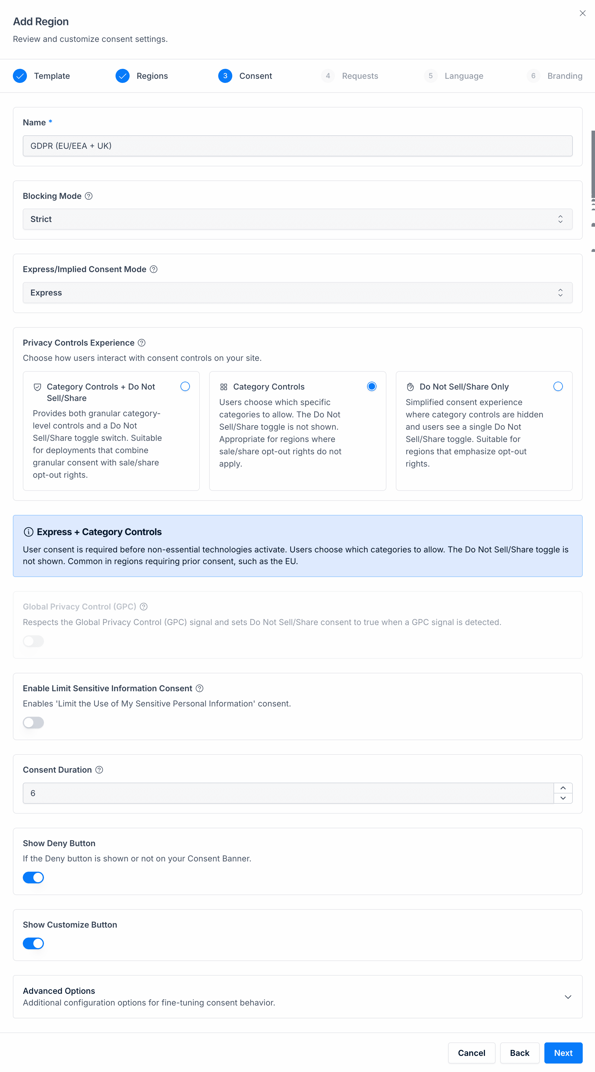 - Note that you must select either the Category Controls + Do Not Sell/Share or Do Not Sell/Share Only option in the Privacy Controls Experience section if you want to enable Global Privacy Control.