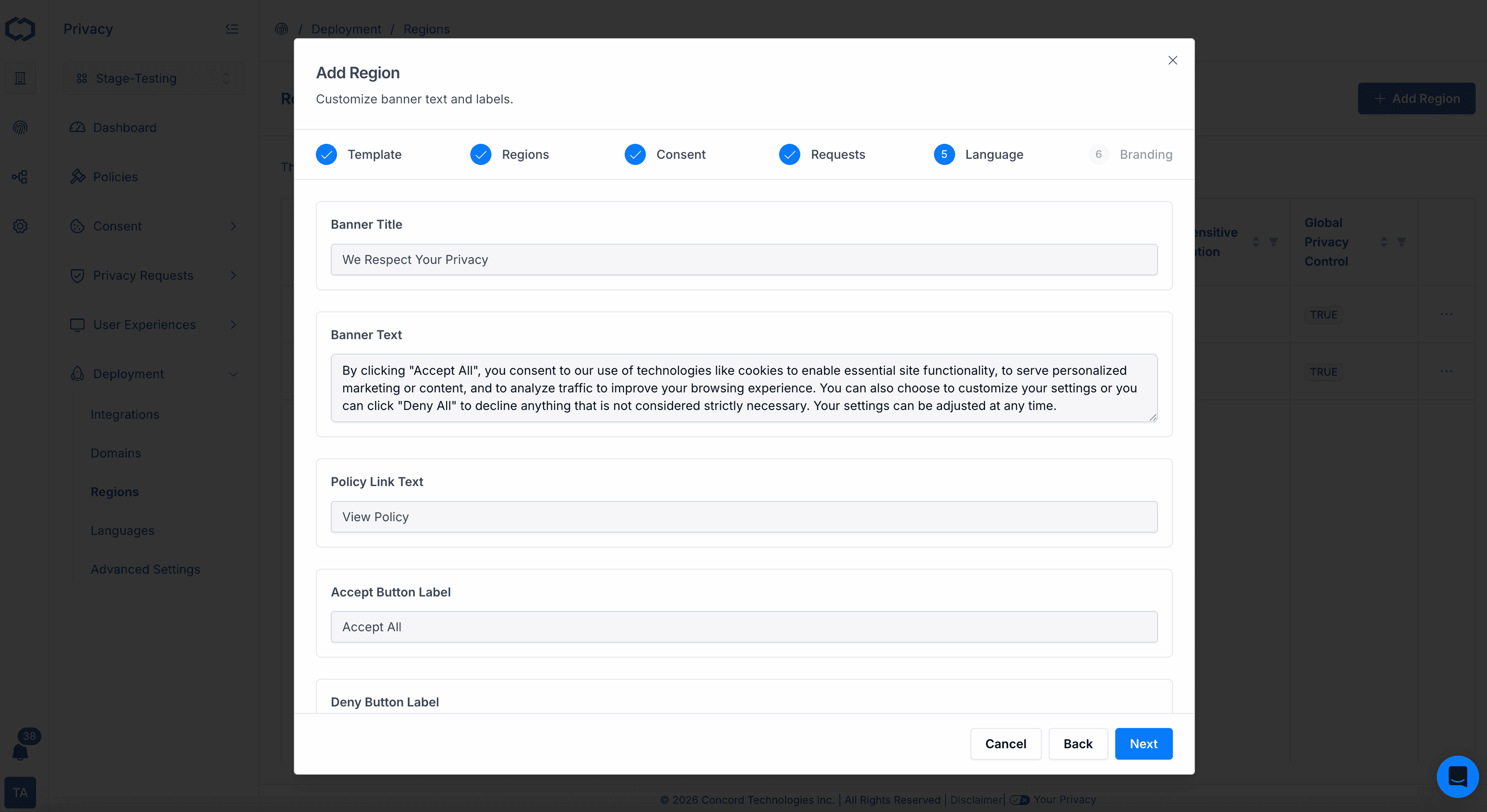 - On the Language page, you can customize the following text on the consent banner for the region you are configuring including: