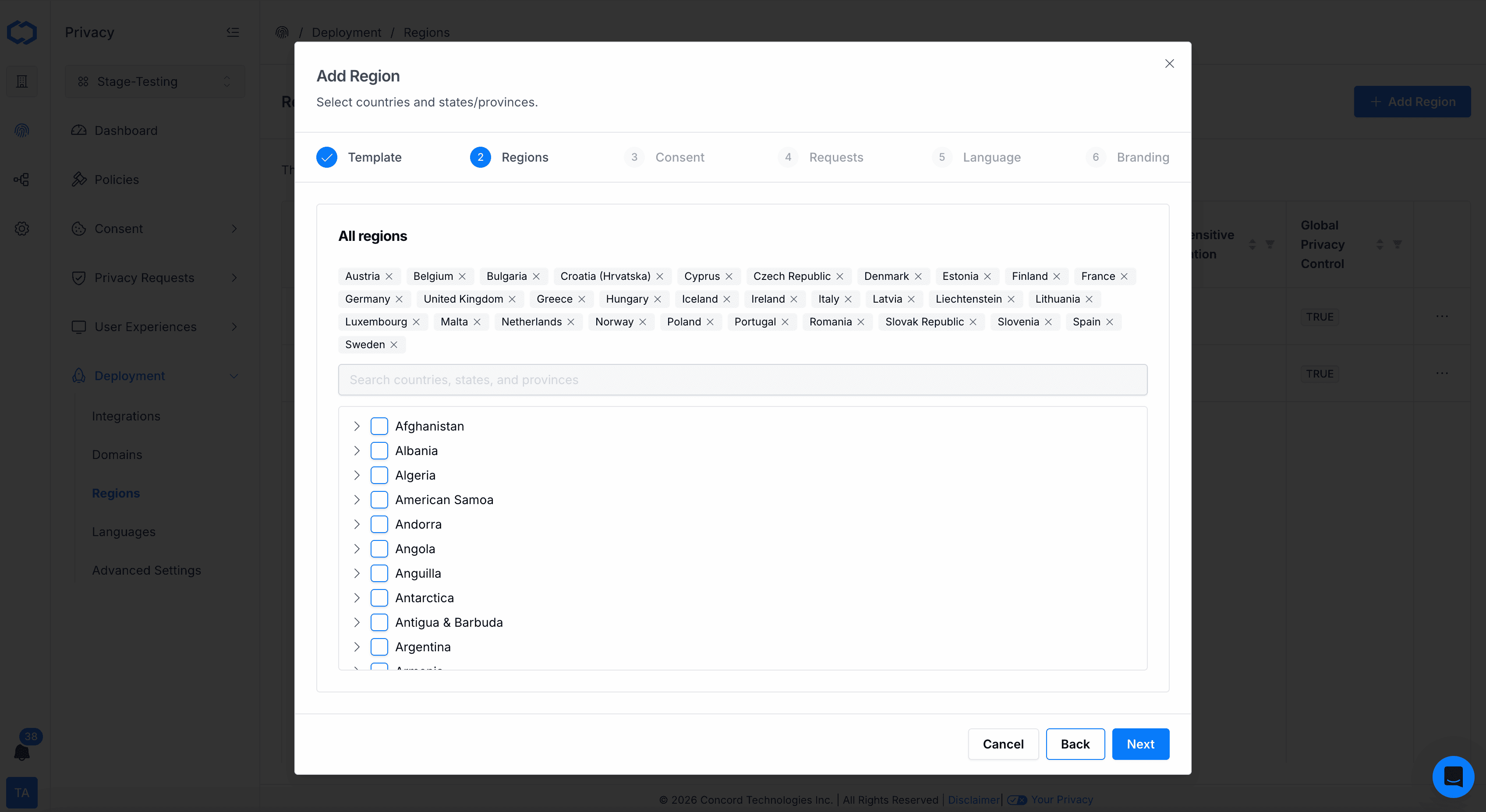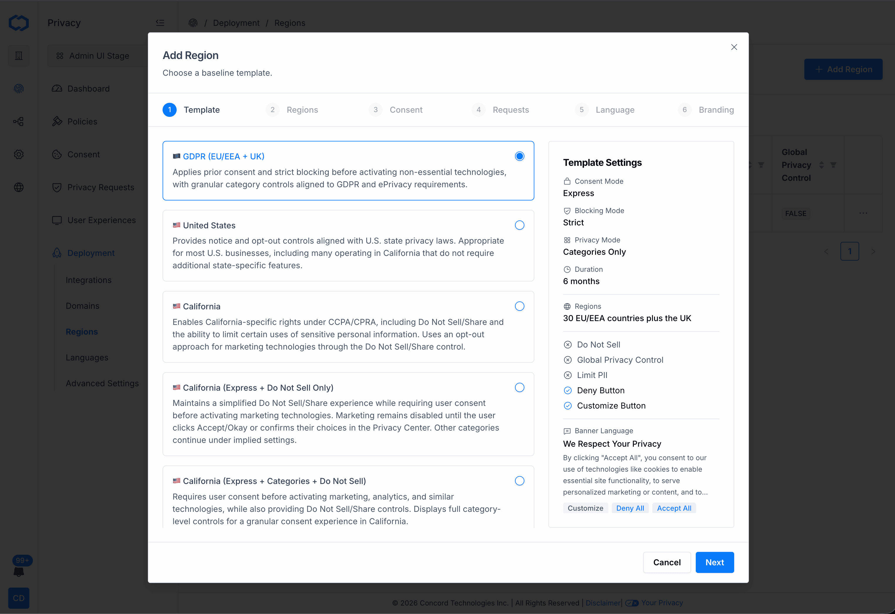 Regions are used to customize the behavior and experience based on an individual user's location. As an example, this allows you to provide different experiences to users based on regional differences (like GDPR in the EU vs. CCPA/CPRA in California). When a user visits your site, we will automatically determine their location and will match them to the most granular region rule that you have setup in Concord. This can go down to the state/province level, which allows for different experiences for different laws (like CCPA/CPRA in California). While you can get as granular as you want, we typically recommend a single global policy that meets the strictest guidelines across regions, or higher splits (like separate GDPR and United States regions). If you have any questions on how and why to configure your regions in certain ways, please reach out to our support team.