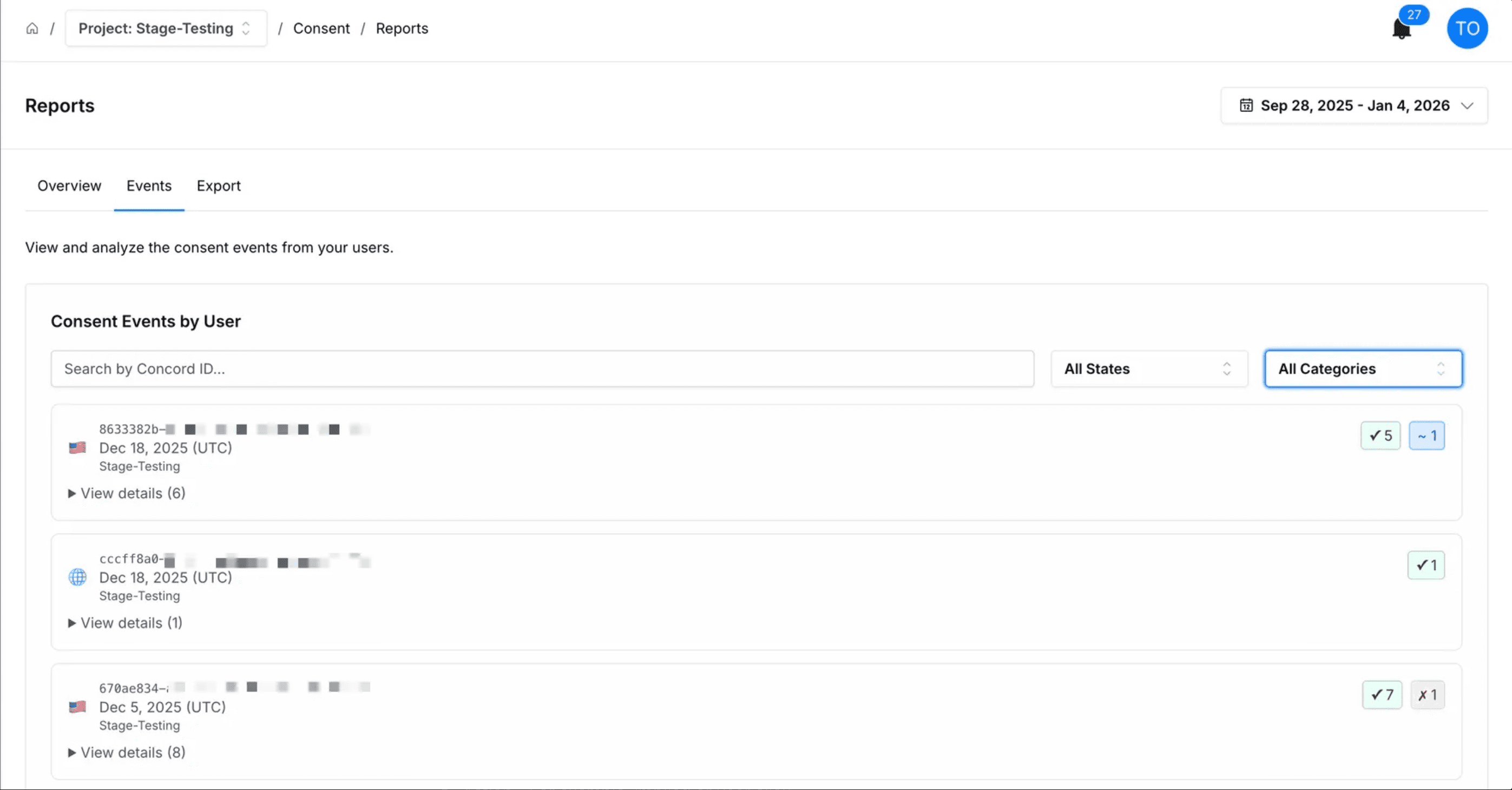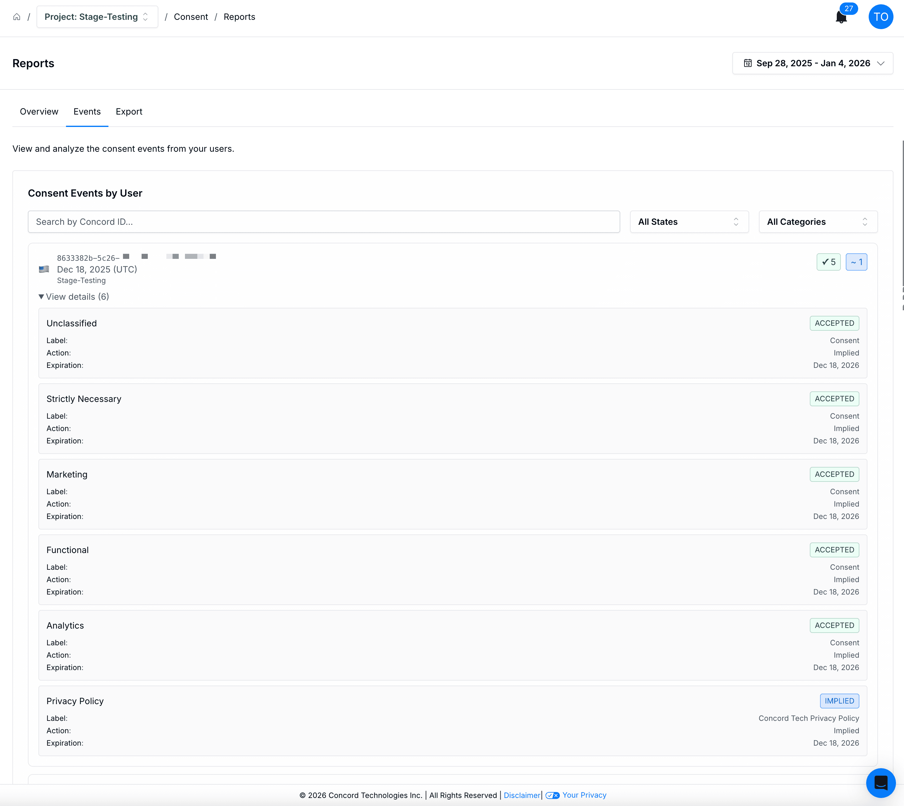 To view a detailed report of consent events in Concord, navigate to Consent → Reports → Events tab in Concord.