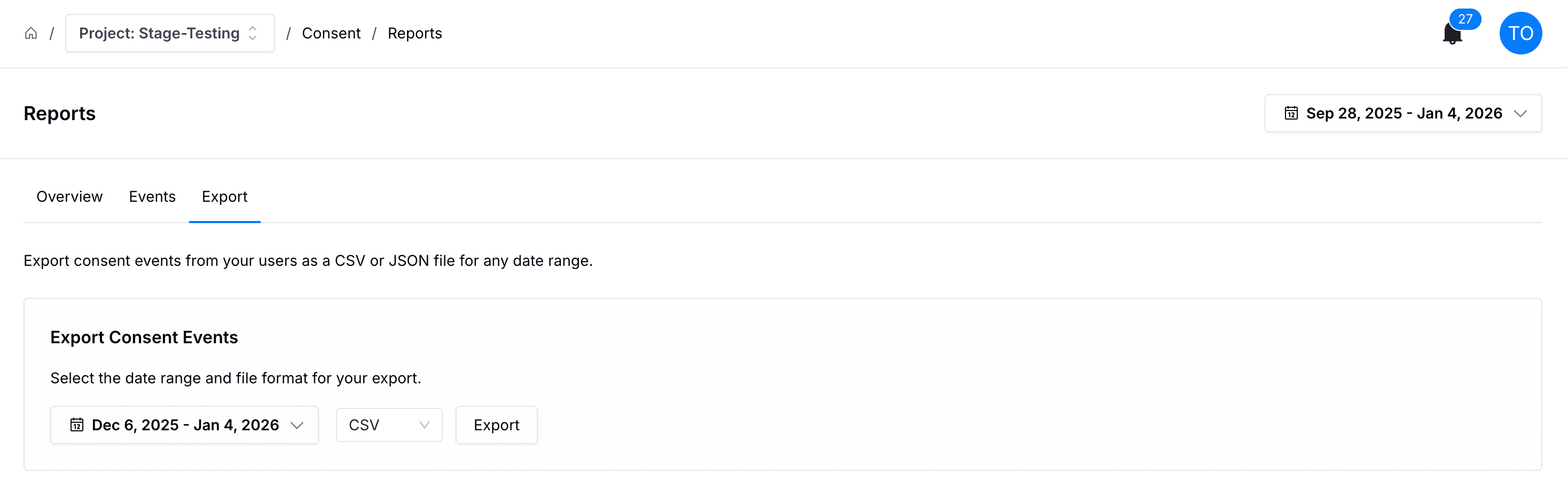 - Export - Export consent events from your users as a CSV or JSON file for any date range.
