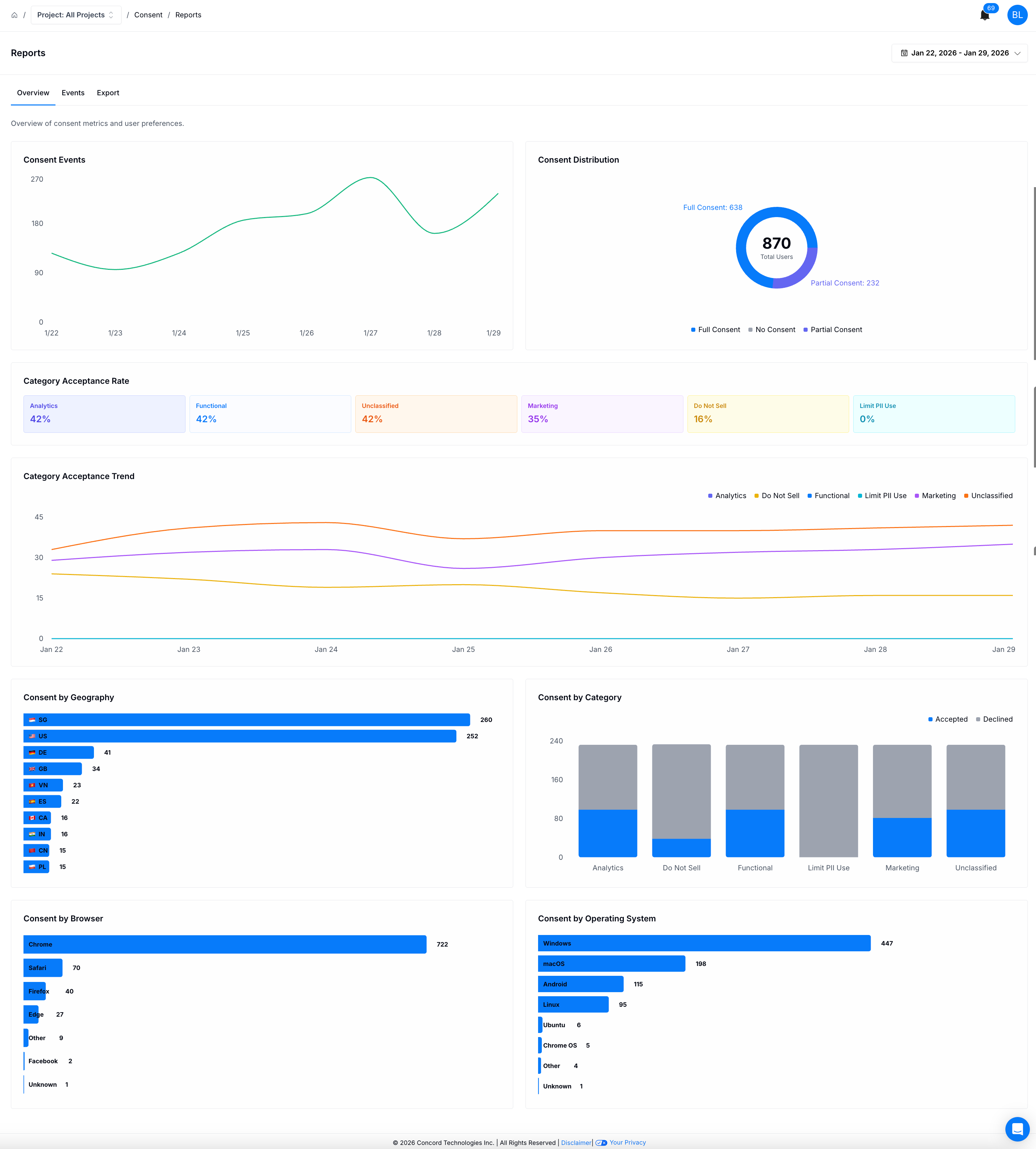 The Consent Reports section in Concord is where you can find reporting on consent metrics and user preferences. You will find the following information in the Consent Reports section: