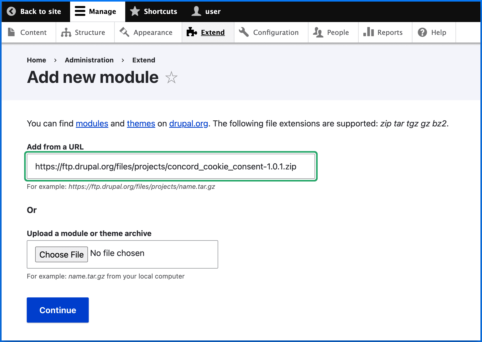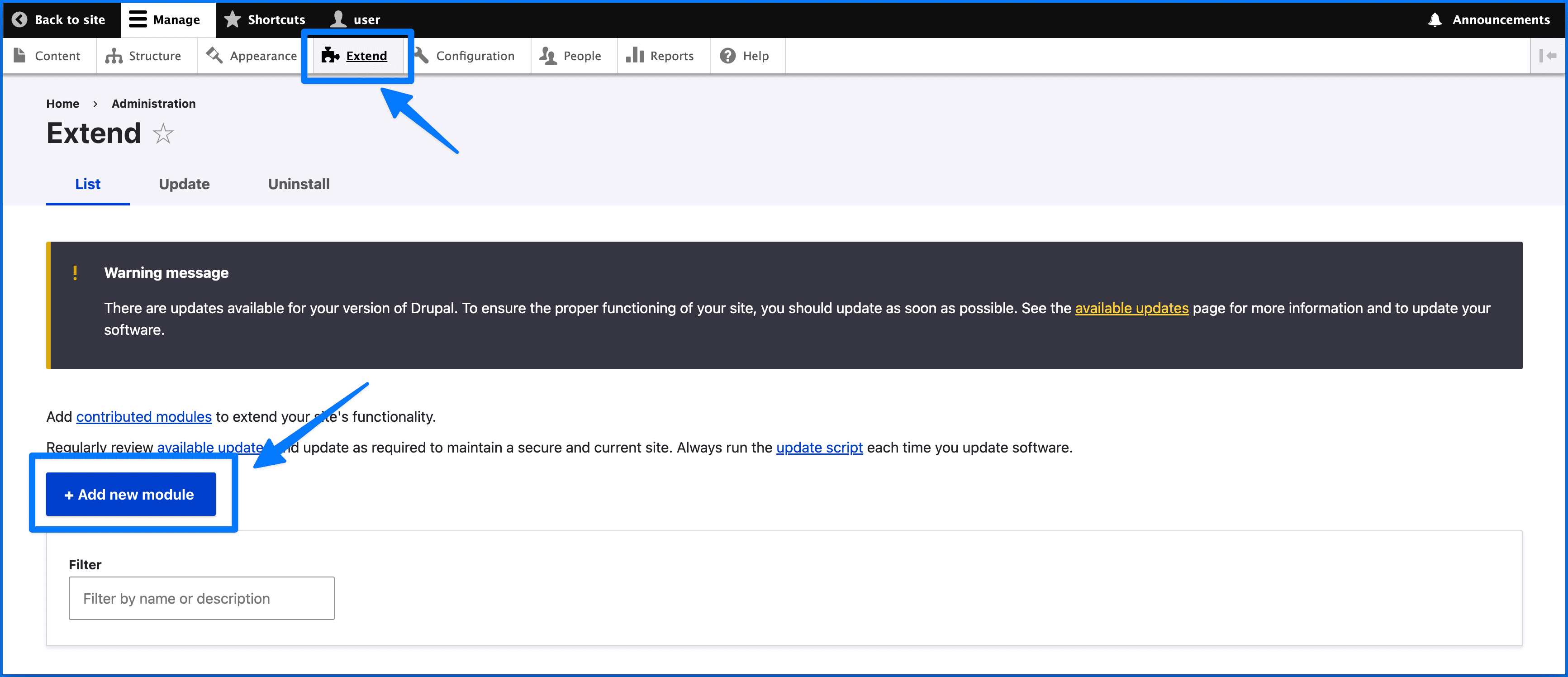 - Open your Drupal instance and go to **Extend **and click Add New Module.