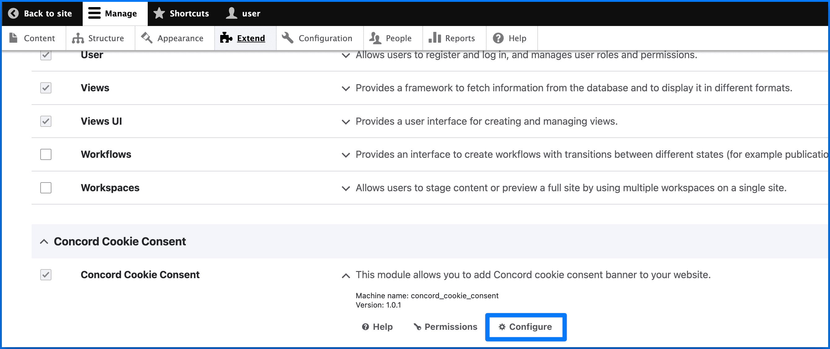 - After installing Concord in your Drupal instance scroll down to the Concord Module and click on Configure.
