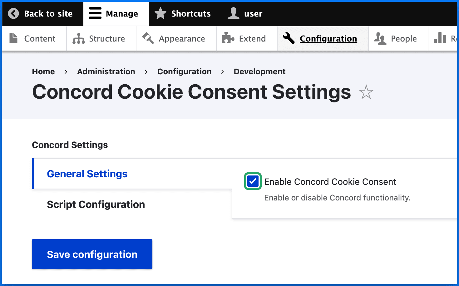 - Check the **Enable Concord Cookie Consent **checkbox.