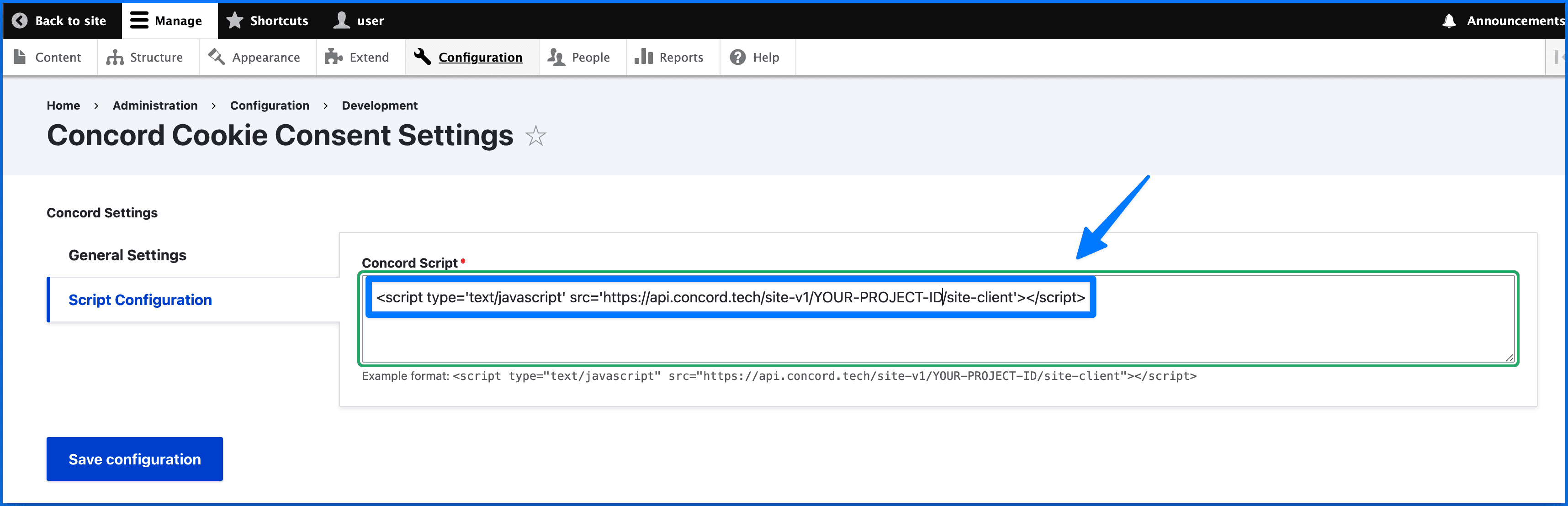 - Go back to Drupal and paste in your script code and click Save Configuration.