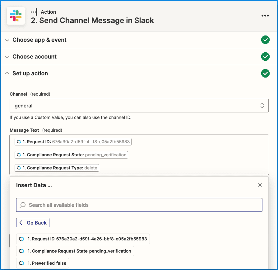 Select the Slack channel you wish to send the compliance request event messages to and select the fields you’d like to include in the message such as “Request ID” and “Organization ID”.