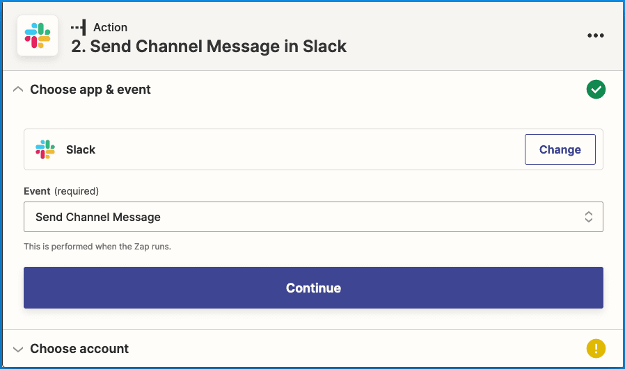 Select Slack as the app event and connect to your Slack account. For the event select “Send Channel Message.”