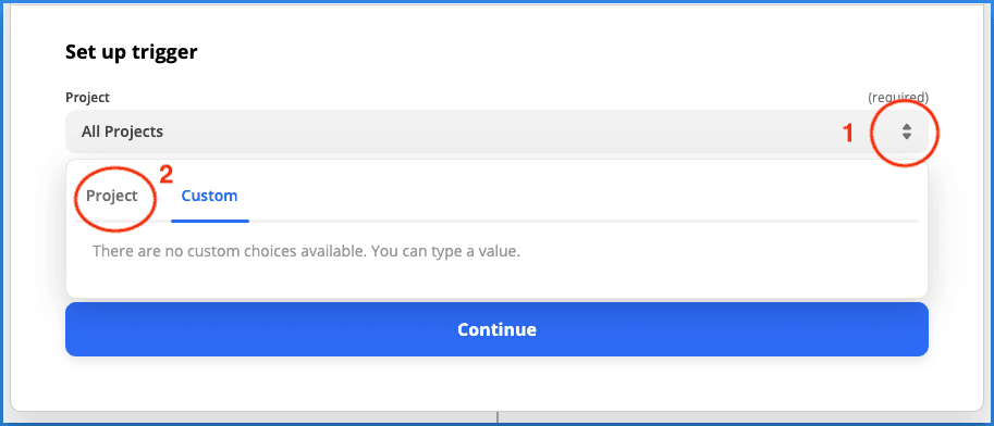 - If you wish to capture all Concord projects in the same Zap, just click Continue. If you wish to select a specific project, click on the drop-down arrows (righthand side of project selector) and then click on the Project tab. The list will be populated with all your available projects.