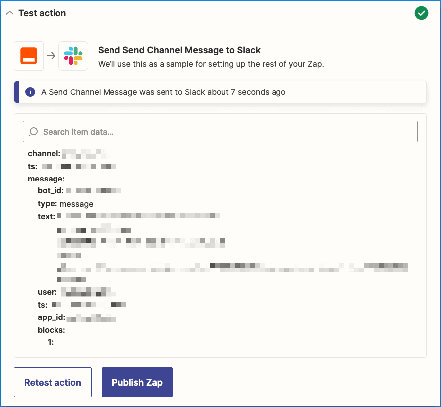 - Test your Zap and check Slack for the test event message.