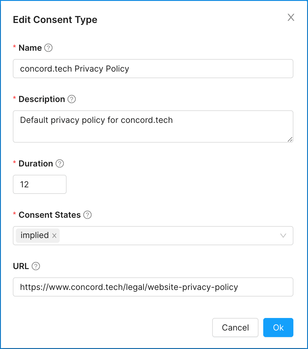 - Name: The Consent Type name is used to identify your Consent Types in Concord and is the friendly name that is shown to your users in Privacy Center.