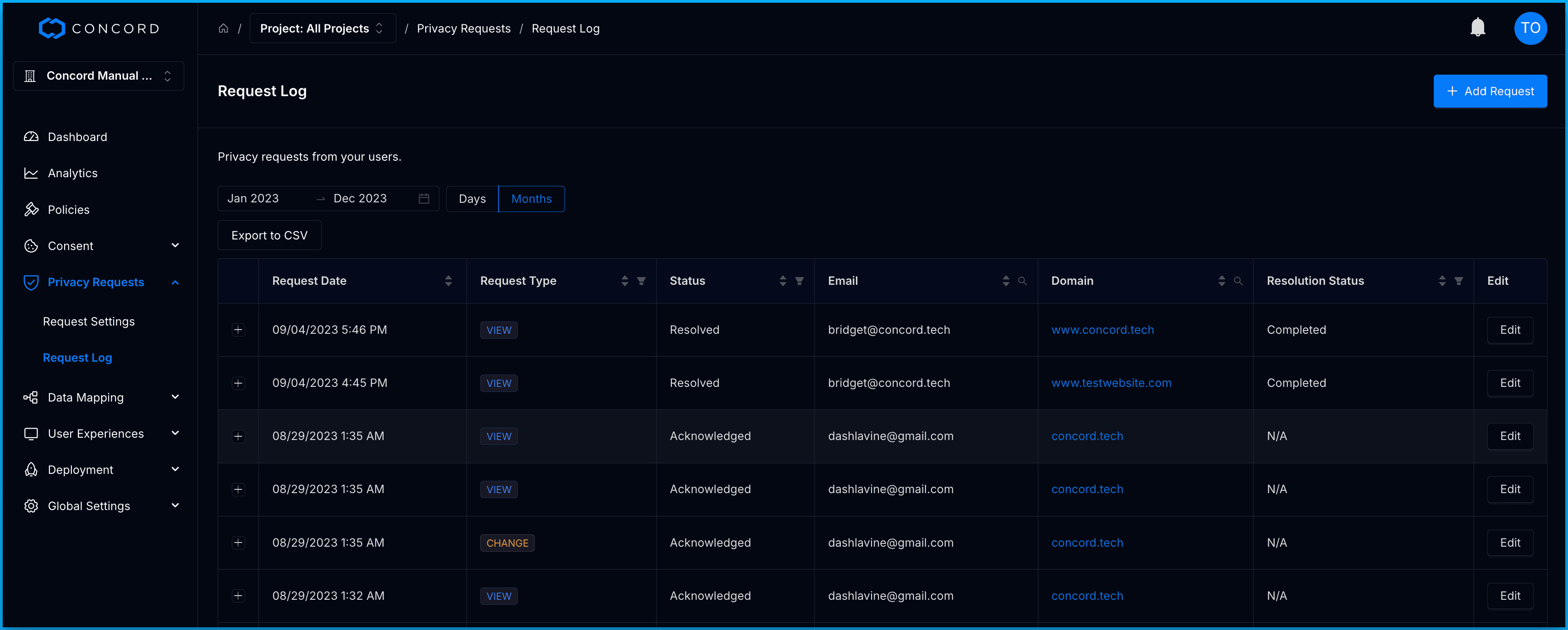 When your users submit Privacy Requests, your team will need to work on and finalize those requests in a timely fashion. You can easily handle these requests within Concord in the Request Log reporting section by selecting and editing an individual request. We recommend that organizations make careful and accurate use of this functionality in order to ensure seamless and error-free compliance with applicable regulations. To learn more about using Privacy Request Log report, refer to this article: Privacy Requests Request Log