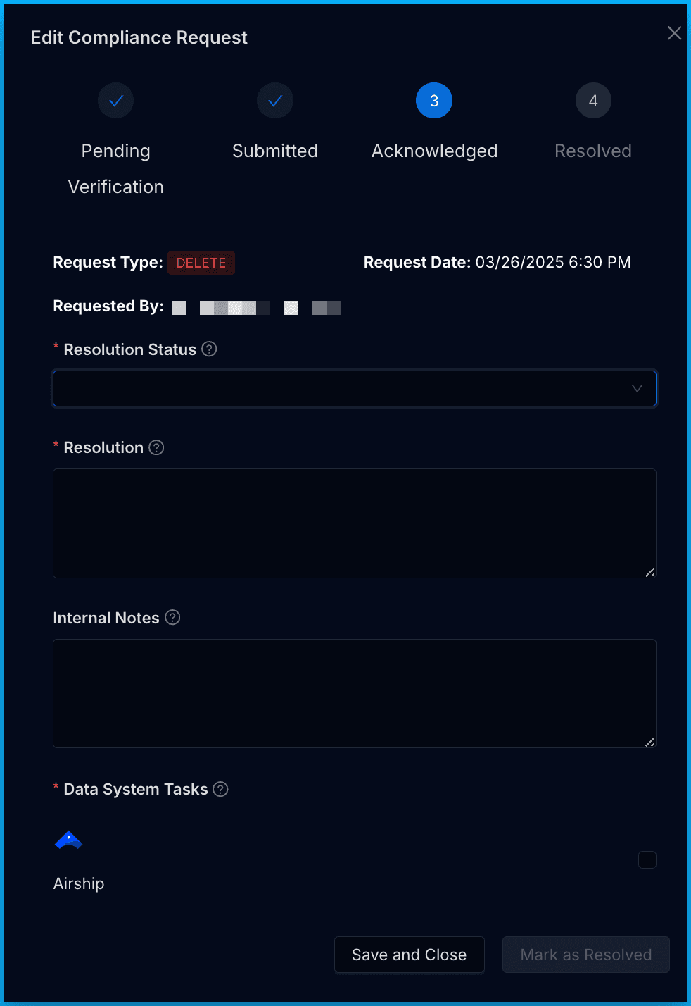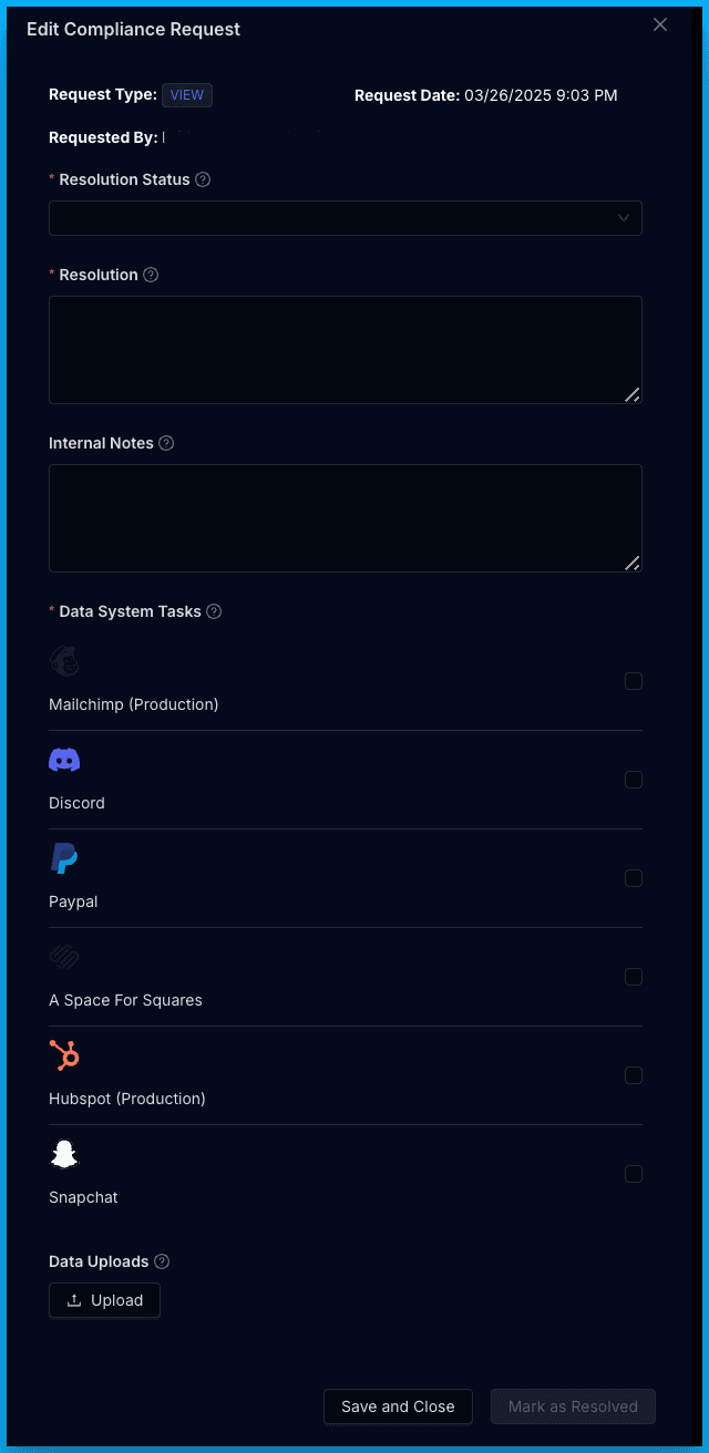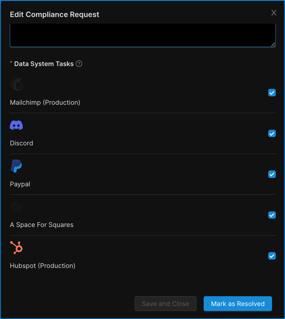 If your Project has active Data Systems, you will also see a Data System Tasks section within the Edit Compliance Request workflow and any Data Systems that were active when the Privacy Request was received will have an associated Task that needs to be completed. To resolve the Privacy Request, complete and mark each Task as completed. We also recommend adding the details for each completed Task to the Resolution field. Once all Tasks are complete and checked off, the request can be resolved by clicking Mark as Resolved.