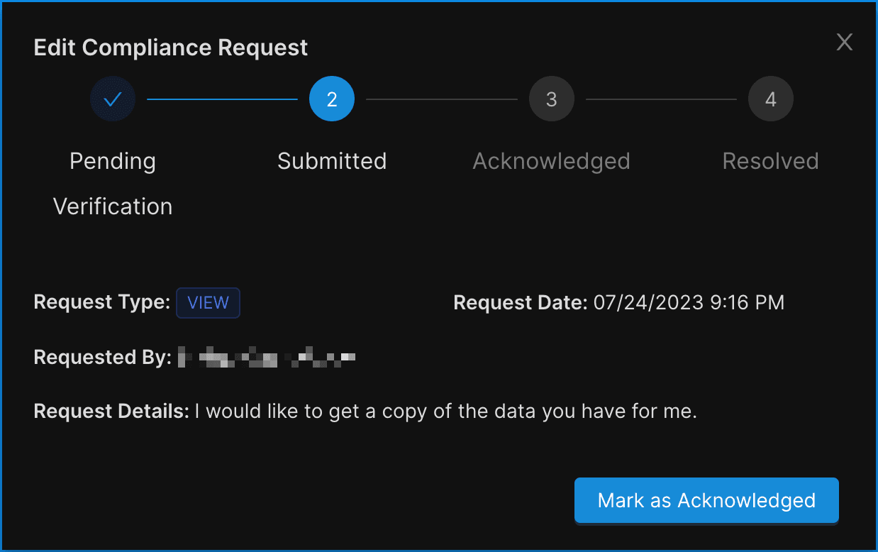 - To change the status of the request, click Mark as Acknowledged.